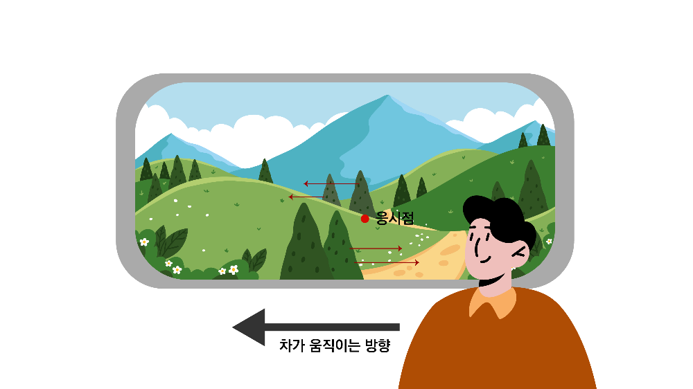 예를 들어 우리가 타고 있는 기차가 움직이면 우리의 망막에 투사된 상도 움직이게 됩니다. 이 상이 움직이는 속도와 방향은 우리가 시선을 집중하고 있는 물체의 위치에 따라 달라집니다. 좀 더 구체적으로 말하면, 응시점보다 가까이 있는 물체의 상과 그보다 멀리 있는 물체의 상은 망막 위에서 서로 반대 방향으로 이동합니다. 그리고 응시점보다 멀리 있는 물체의 상은 그 물체까지의 거리가 멀어질수록, 응시점보다 가까이 있는 물체의 상은 그 물체까지의 거리가 가까워질수록 그 움직임이 빨라집니다. 물론 거리와 방향 및 속도 간의 이러한 관계들은 규칙적이며, 바로 이 규칙성이 우리의 시각체계가 거리를 지각하는 데 이용되는 단서입니다.