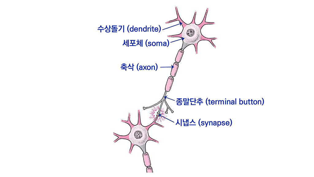 세포체는 일반적인 세포의 기능을 하는 부위로, 유전정보가 담긴 세포핵, 에너지 생산 공장인 미토콘드리아 등이 있습니다. 이 세포체와 수상돌기를 통해서 다른 뉴런으로부터 정보를 받는 것입니다. 받은 정보는 축삭을 통해 다른 뉴런과 근육, 분비선 등으로 전달됩니다. 축삭의 끝 부분에서 여러 개의 가지로 나누어지는데 이것이 종말단추입니다. 종말 단추는 다음 뉴런과 시냅스(synapse)를 형성해 연결되어 있습니다. 이 시냅스에서 뉴런과 뉴런 사이의 정보 전달이 일어납니다. 뉴런의 축삭을 타고 내려온 신경충동이 종말단추에 있는 신경전달물질에 의해 시냅스를 건너 다음 뉴런이나 다른 세포에 정보가 전달되는 식입니다. 시냅스는 서로 아주 미세한 간격을 띄고 연결되어 있습니다. 한 뉴런의 세포체나 수상돌기에는 약 1,000개의 시냅스가 있습니다. 이 시냅스 연결은 고정되어 있는 것이 아니라 여러가지 요인으로 인해 변화합니다.